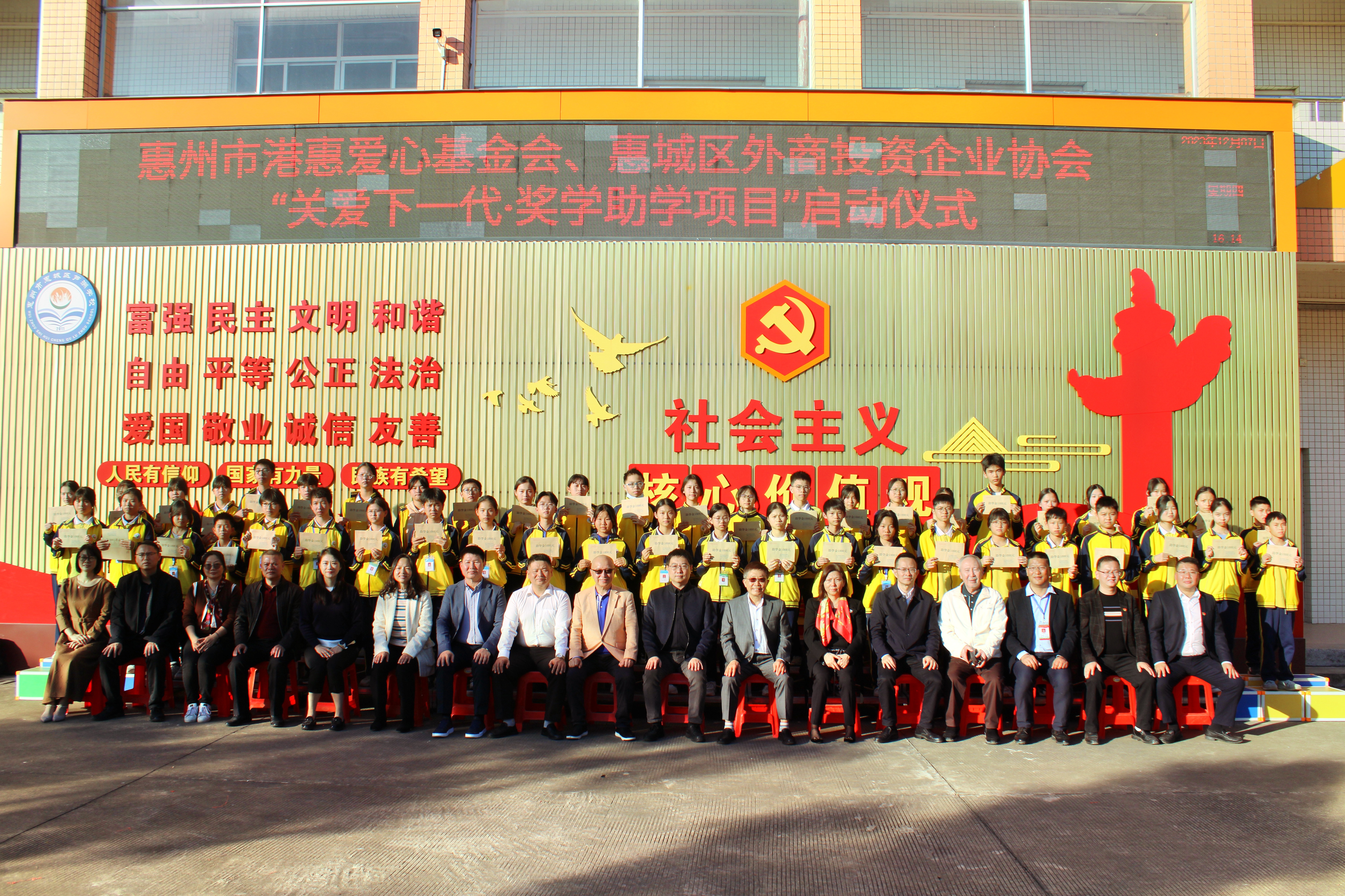 情系莘莘学子,真情温暖人心。为激励广大学子树立远大志向、努力求学、奋发进取;帮助家庭困苦、品学兼优的学生克服困难,推动乡村教育事业高质量发展,由惠州市港惠爱心基金、惠城区外商投资企业协会联合资助的“关爱下一代•奖学助学”项目于12月7日在惠城区芦洲学校正式启动。惠城区教育局副局长苗继佳,惠城区教育局机关党委纪委书记彭志,横沥镇政府副镇长李惠琼,芦洲镇政府副镇长喻炜立,我协会会长、基金会常务副主席王玉珍,协会名誉会长、基金会永远名誉主席洪光汜,协会名誉会长、基金会常务副主席林长泉,协会常务副会长、基金会常务副主席杨伟定,协会副会长、基金会监事苏石永,协会青委、基金会监事廖敏敏,协会青委刘敏燕以及横沥镇、芦洲镇5所中学的校长等领导出席了本次活动。