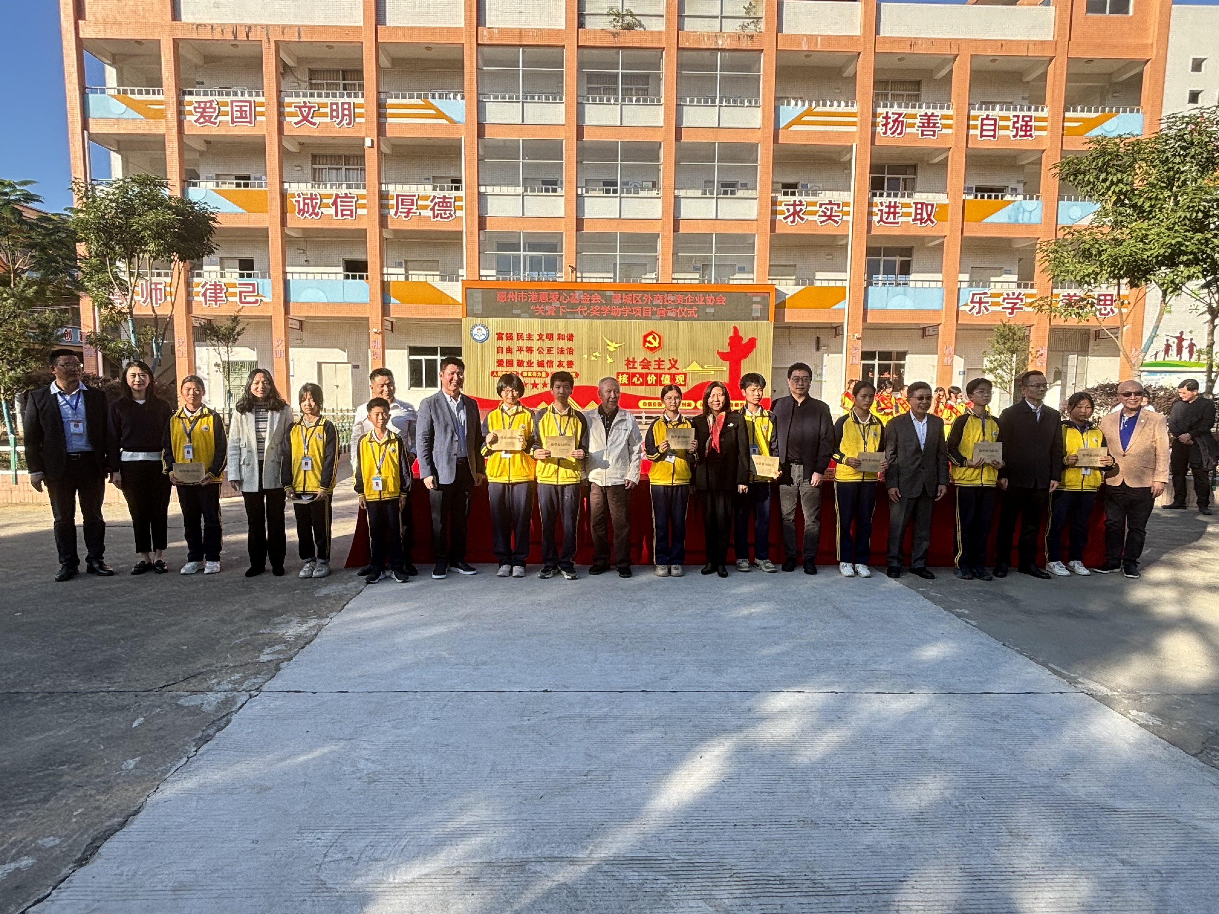 我会“关爱下一代·奖学助学”项目每年从惠州市港惠爱心基金会创始资金拨付10万元资助芦洲镇、横沥镇5所中学学生,设奖学金和助学金。奖励学习态度积极、相较于初一年级综合评价结果进步明显、品学兼优、学习成绩和综合评价排名前列的初二学生;帮助家庭经济条件较差且勤学善学的在校学生。本次启动仪式为50名家庭经济条件较差且勤学善学的学生颁发助学金,2024年9月将为进步明显的学生颁发奖学金。