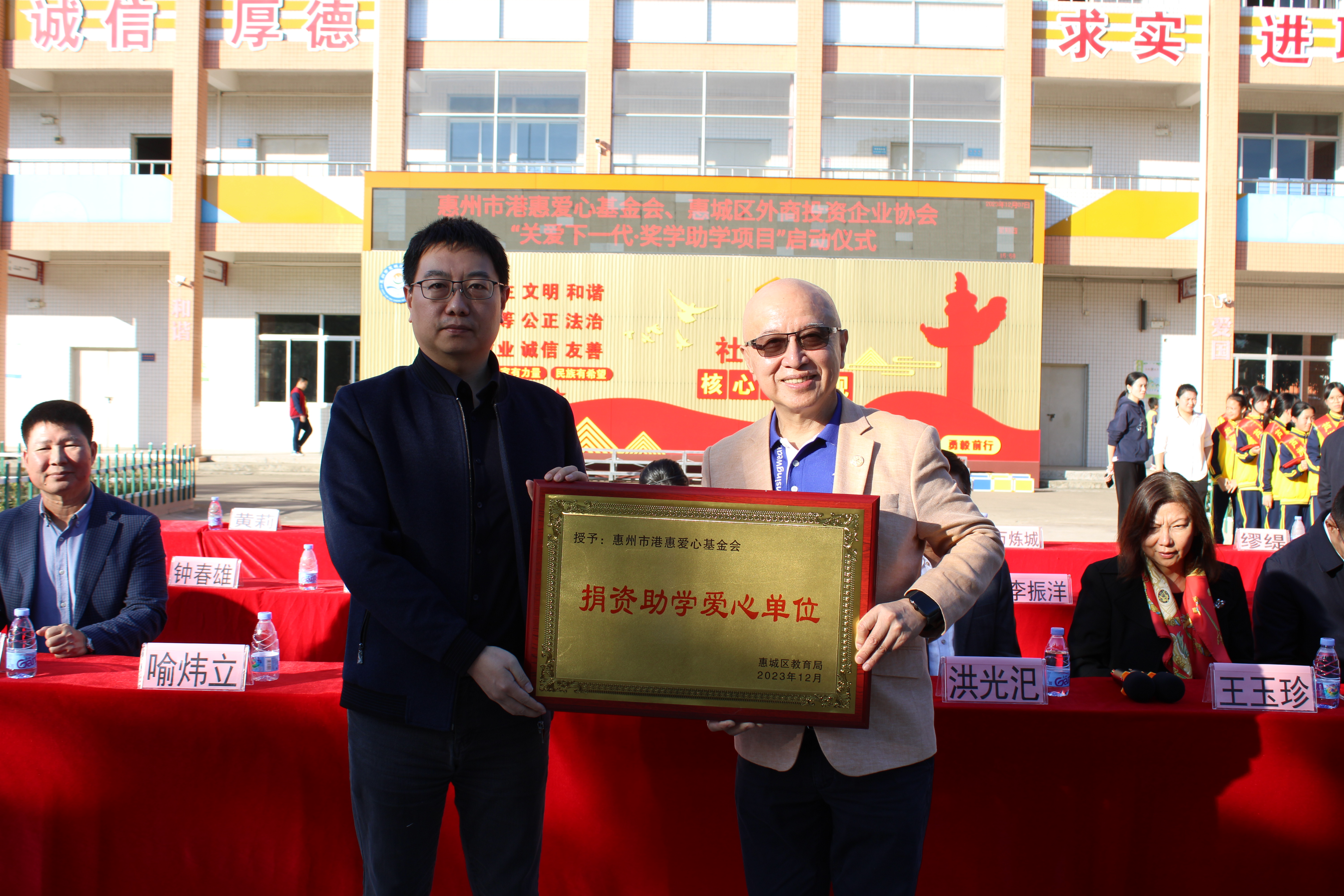 惠城区教育局苗继佳副局长为惠州市港惠爱心基金会、惠城区外商投资企业协会颁发慈善牌匾。