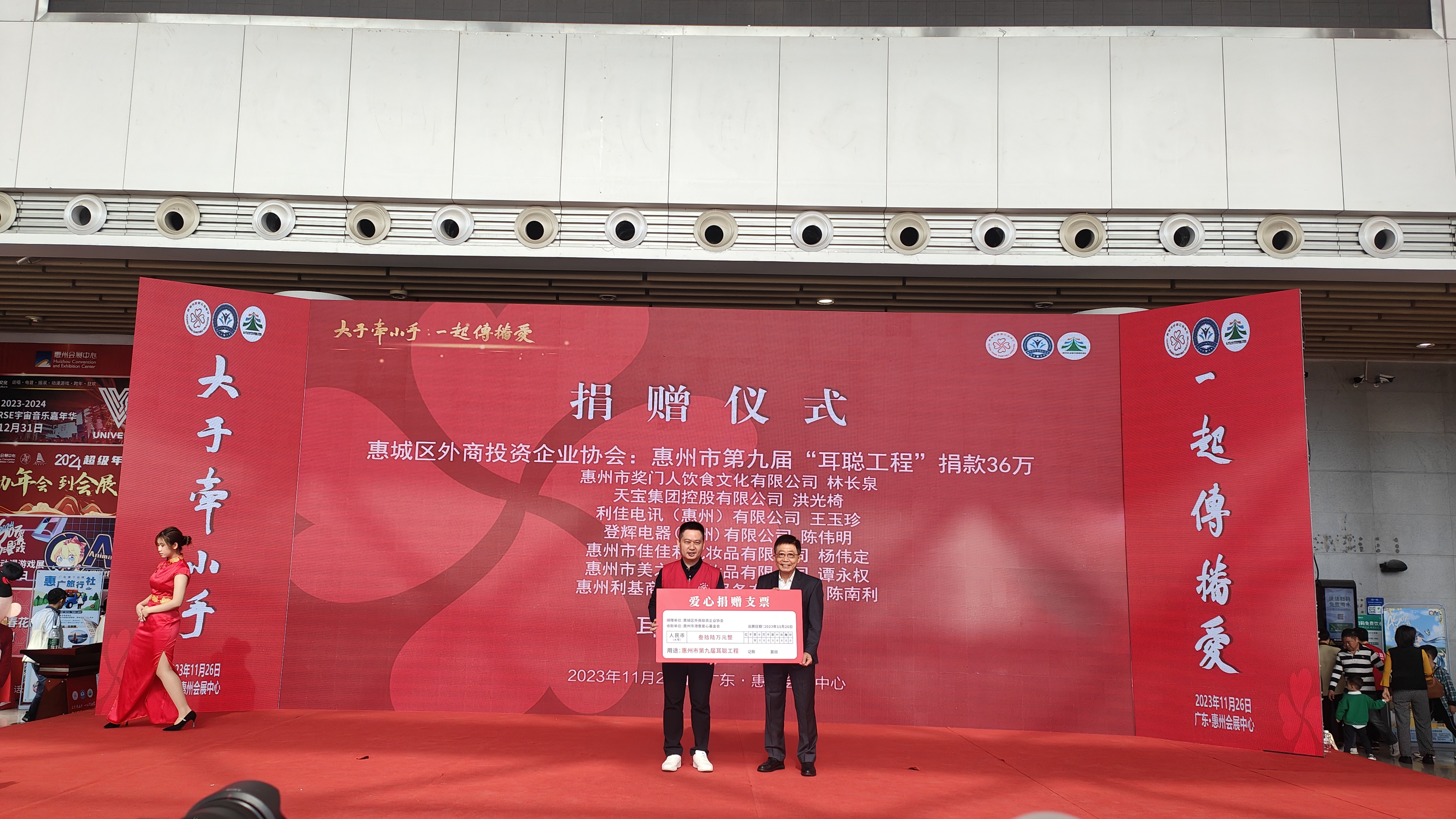 启动仪式中,洪光椅名誉会长代表协会向惠州市第九届“耳聪工程”捐赠截止11月24日筹集的善款36万元。我协会已积极连续8年参加了义卖活动,切实履行社会责任,传递社会正能量。
