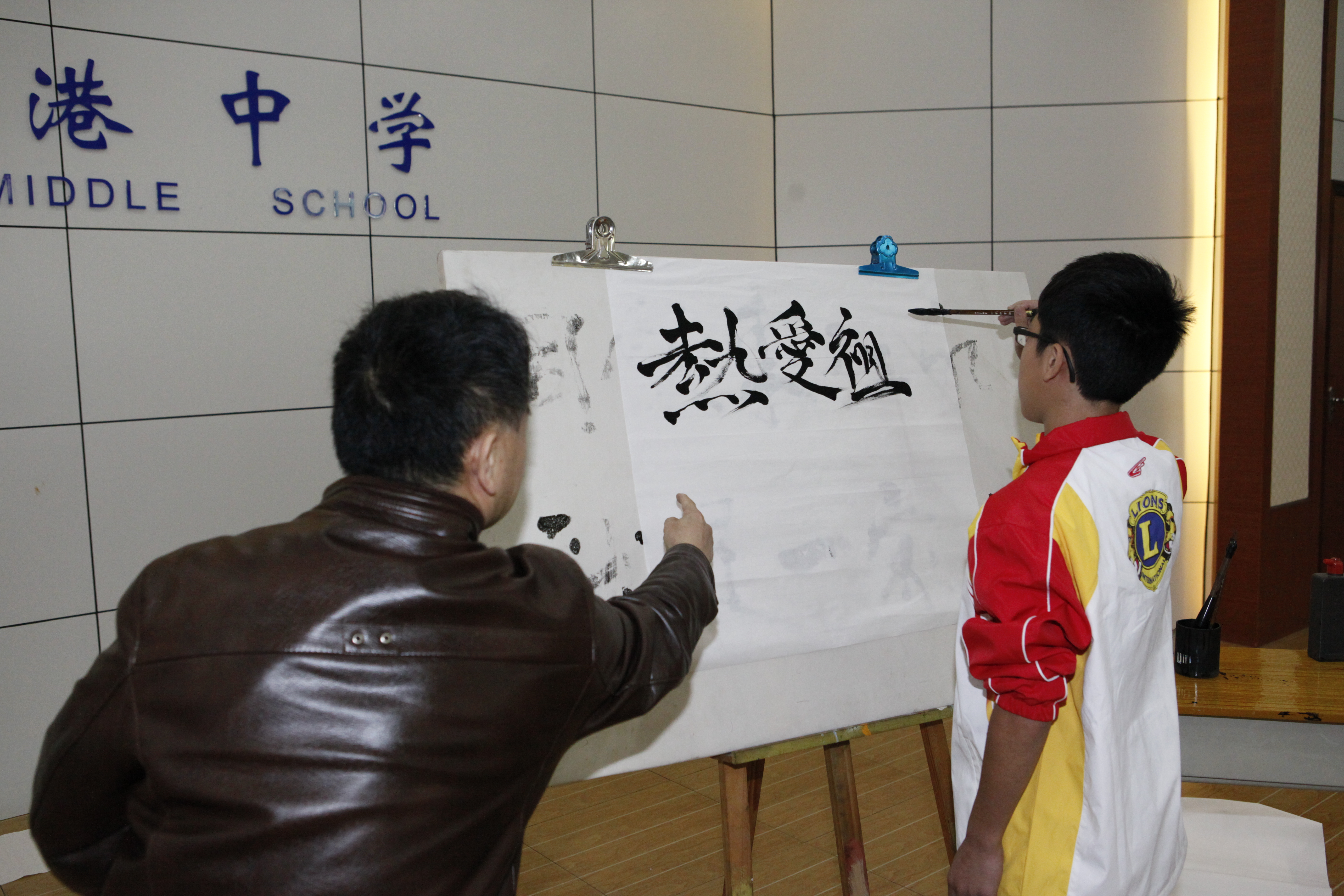 4月10日早上,学生们离开基地来到惠州市惠港中学。在学校的学术报告厅,香港学生与惠港中学学生一起分享了惠港紫荆花艺术合唱团的演出、《国粹之魅——京剧》的演出、陈志华老师的书法表演,还邀请了香港学生代表上台学写毛笔字。课后,学校赠送香港代表脸谱书签,以作留念。