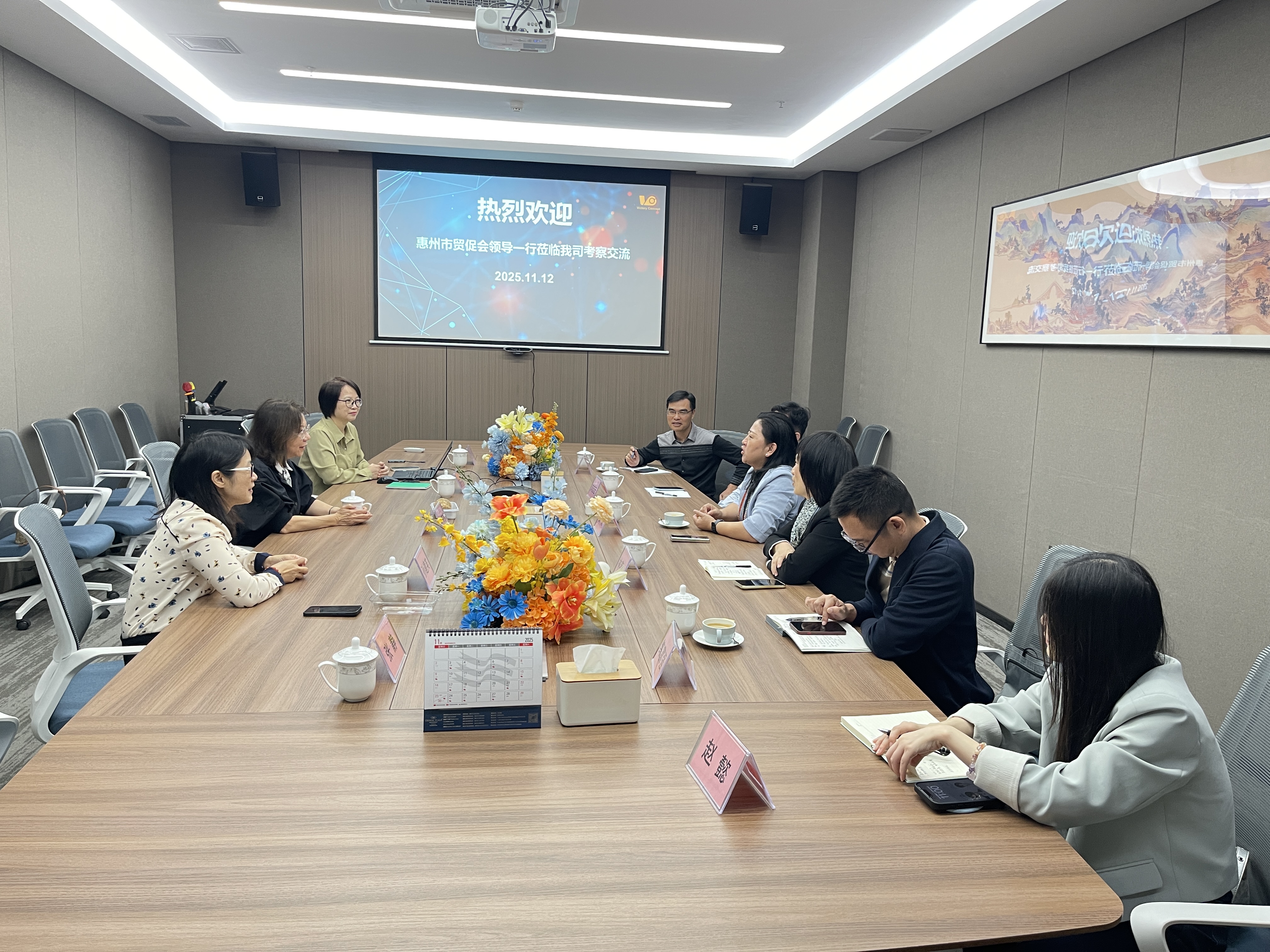 2025年11月12日上午,惠州市贸促会费霞会长率队莅临我会会长单位—利佳电讯(惠州)有限公司开展调研考察活动。随行的有惠州市贸促会副会长刘志宏、林奕敏,秘书长练富强,惠城区科工信局外经贸促进股负责人张坚、股长赵懿。利佳电讯董事总经理、我会会长王玉珍热情接待了到访一行。