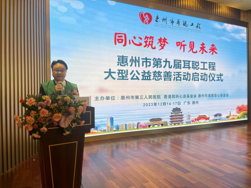 惠城区人大常委会副主任、惠州市第三人民医院院长李雪松致欢迎辞。他表示耳聪工程九年来在社会各界爱心企业和爱心人士的鼎力支持下,收到善款超1200万元,帮助了本地区及周边地区五百多名耳聪患者,其中有四百多名是儿童耳疾患者,帮助他们从耳疾病痛的世界回归到正常生活。未来将继续发挥公立医院公益性和人民医院为人民的属性,把慈善公益事业办好办实,以实际行动诠释公立医院的责任担当,共同为人民健康,慈善事业贡献力量。