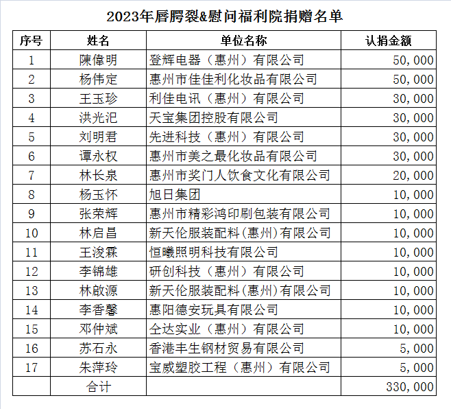 从2016年起至今,我会经连续8年资助唇腭裂贫困患者共118人次,共支出善款¥1,477,979.71元,善款通过惠州市港惠爱心基金会监管专项资金,转账至四川华西口腔医院支付患者的手术费用。