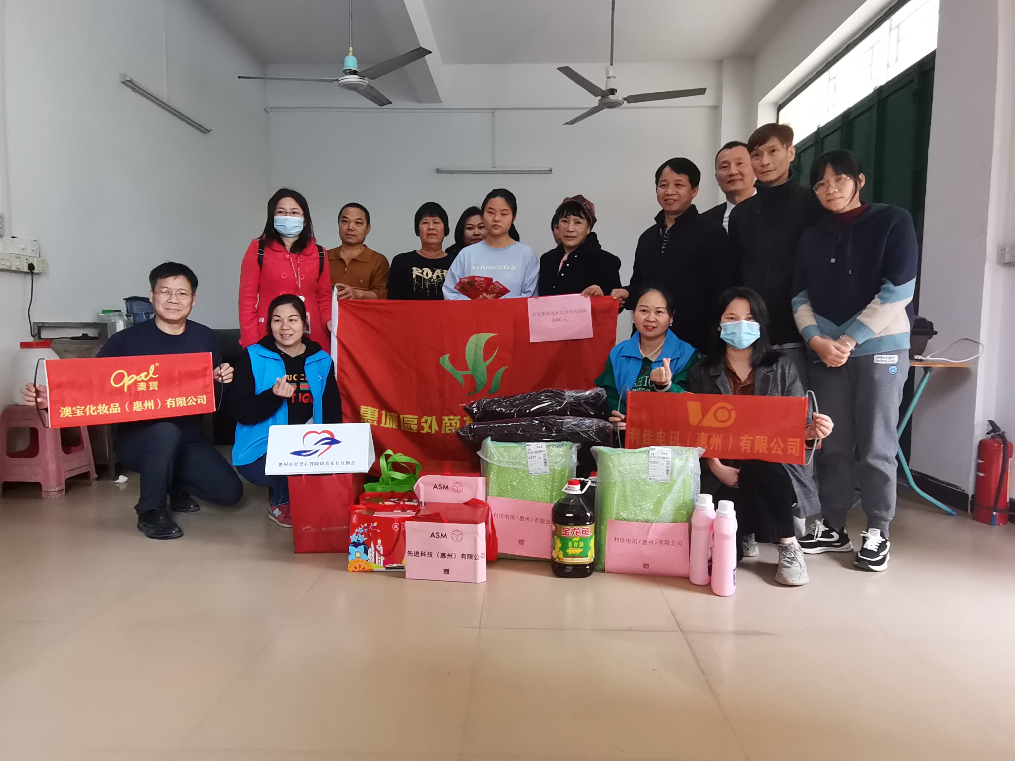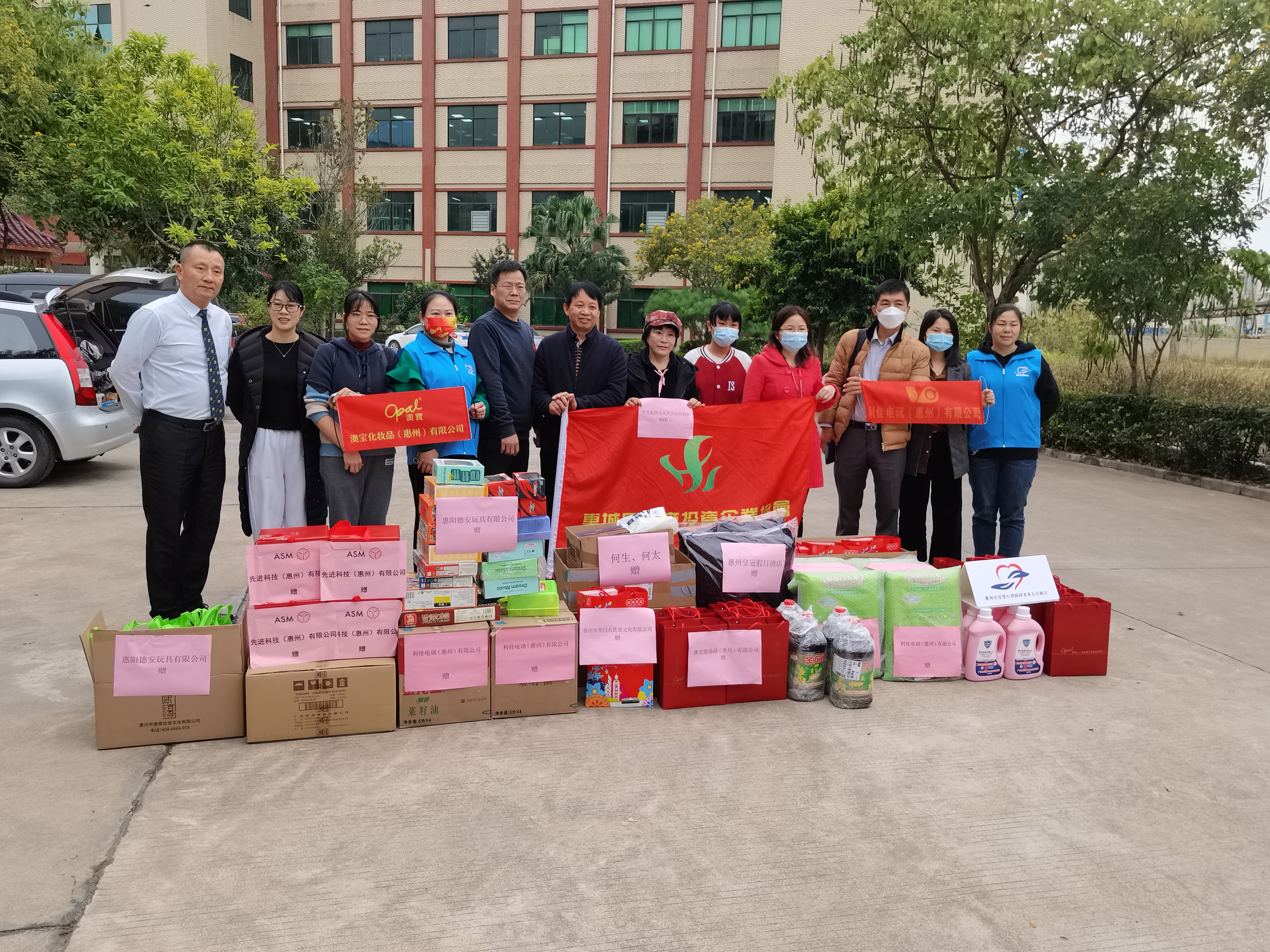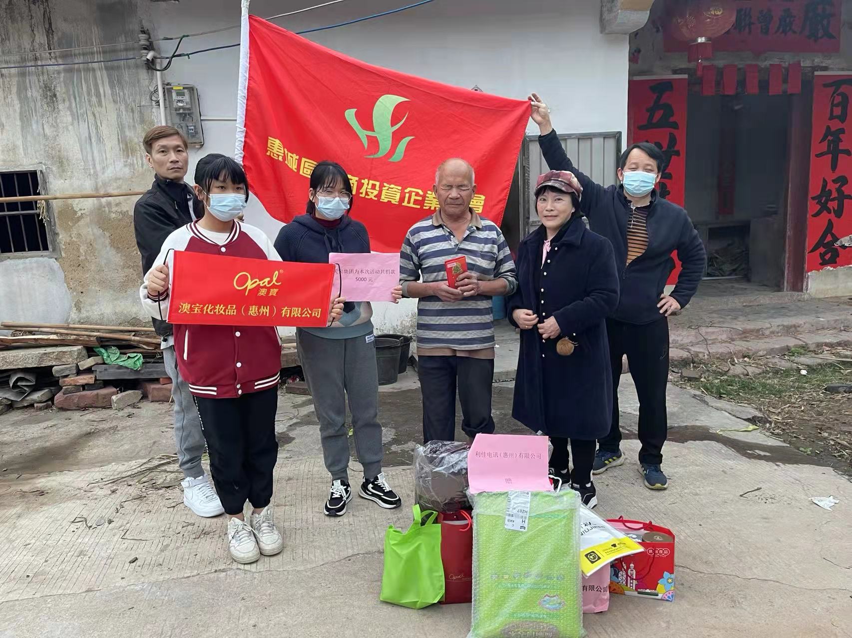 本次探访活动得到苏石永副会长、惠阳德安玩具有限公司、天宝集团控股有限公司、利佳电讯(惠州)有限公司、广东何生何太传媒有限公司、惠州市奖门人饮食文化有限公司、先进科技(惠州)有限公司、登辉电器(惠州)有限公司、澳宝化妆品(惠州)有限公司、惠州智富五金制品有限公司、惠州皇冠假日酒店、惠州市进盈塑胶五金制品有限公司、惠州市佳誉制衣有限公司等爱心企业的大力支持,筹集了慰问金及一批生活用品、食品、玩具。