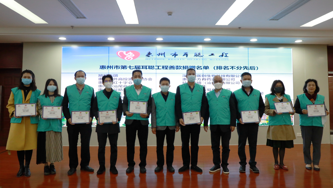 2021年12月18日上午,由惠州市第三人民医院、惠州市港惠爱心基金会、香港耳听心言基金联合举办的“惠州市第七届耳聪工程大型公益慈善活动”启动仪式在惠州市第三人民医院医东院区举行。惠城区人民政府副区长彭亮,惠州市卫生健康局党组书记、局长邹忠平,惠州市委宣传部市文明办副主任余俊波,我会会长、基金会常务副主席王玉珍,常务副会长、基金会委员杨伟定,名誉会长、基金会主席洪光汜,名誉会长、基金会常务副主席林长泉等领导及会员企业代表出席了活动。