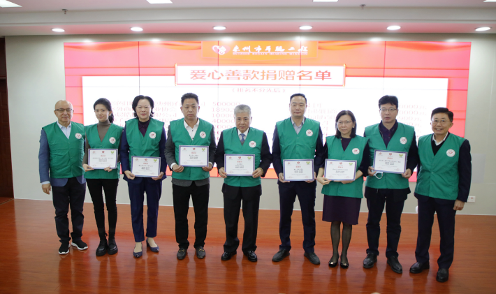 洪光汜主席、林长泉常务副主席代表港惠爱心基金会上台为爱心人士颁发感谢状。