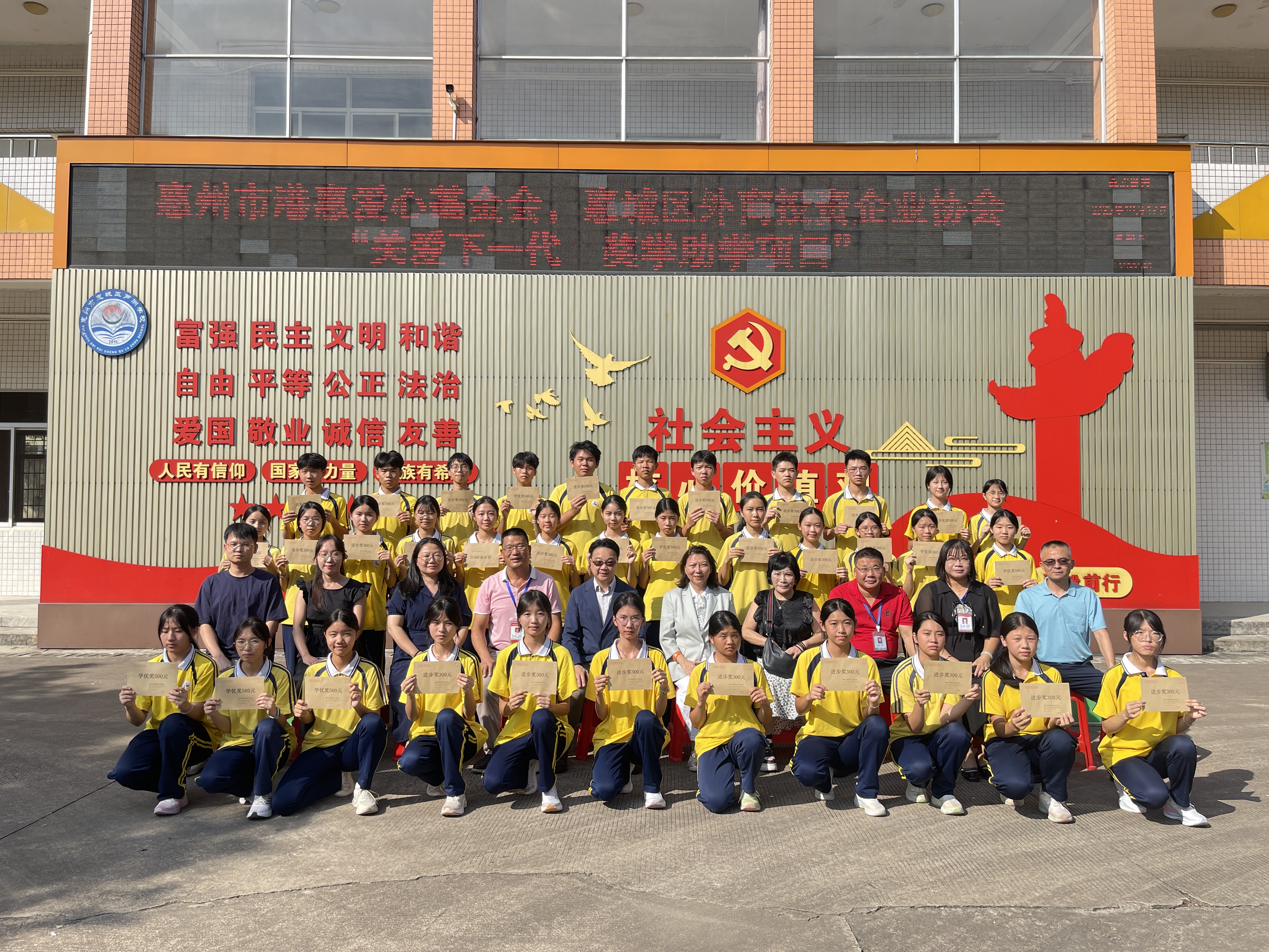 情系莘莘学子,真情温暖人心。为激励广大学子树立远大志向、努力求学、奋发进取。由惠州市港惠爱心基金会和惠城区外商投资企业协会资助的“关爱下一代•奖助学金”项目,今年已于10月17日在惠城区横沥中学和芦洲学校隆重举行奖学金颁发仪式,为133名品学兼优、积极进步的学生颁发了奖学金。该项目至今已累计为100名有需求且勤学善学的学生及268名品学兼优、进步显著的学生分别颁发助学金、奖学金。